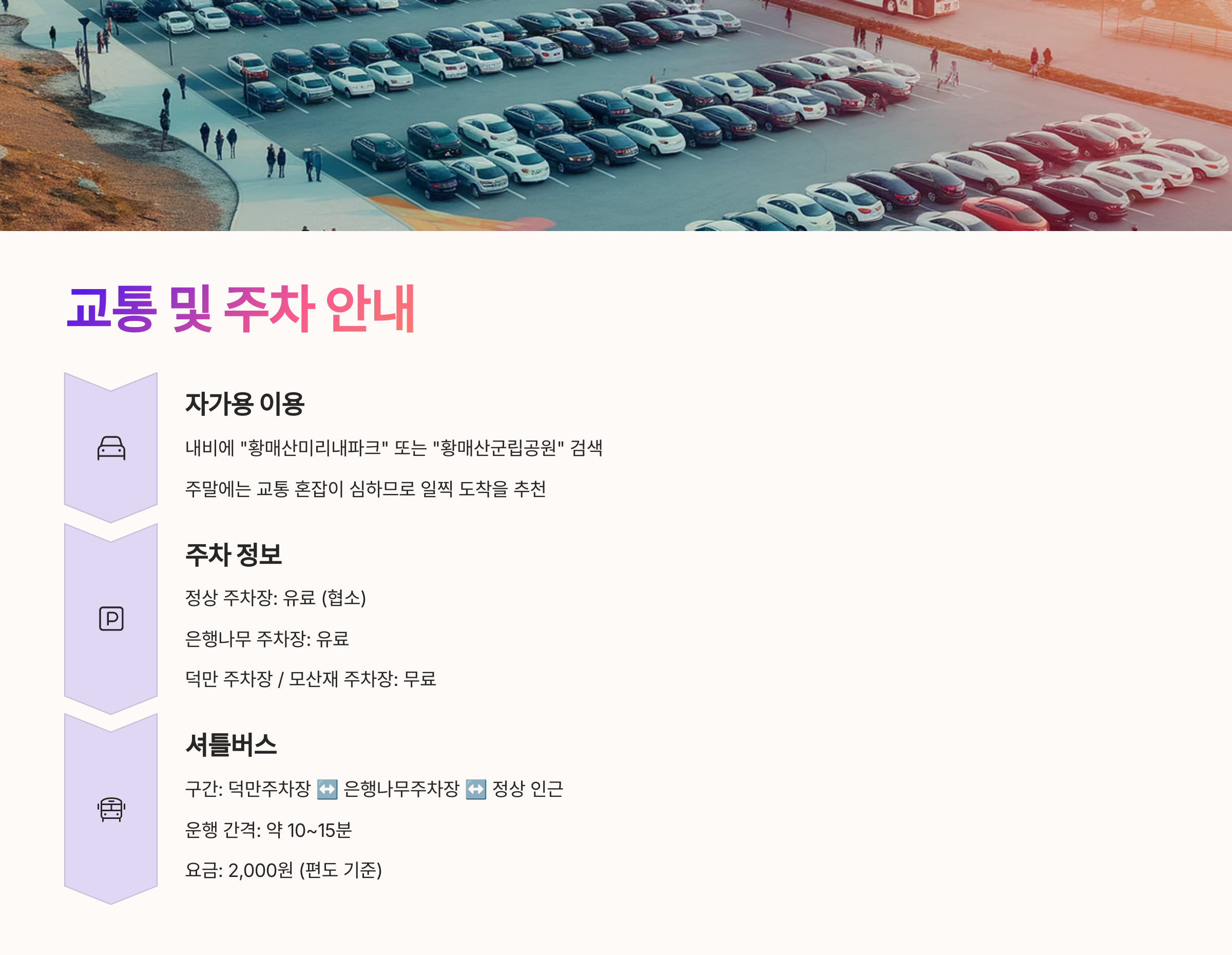 - 입장료는 무료지만, 주차/셔틀은 유료