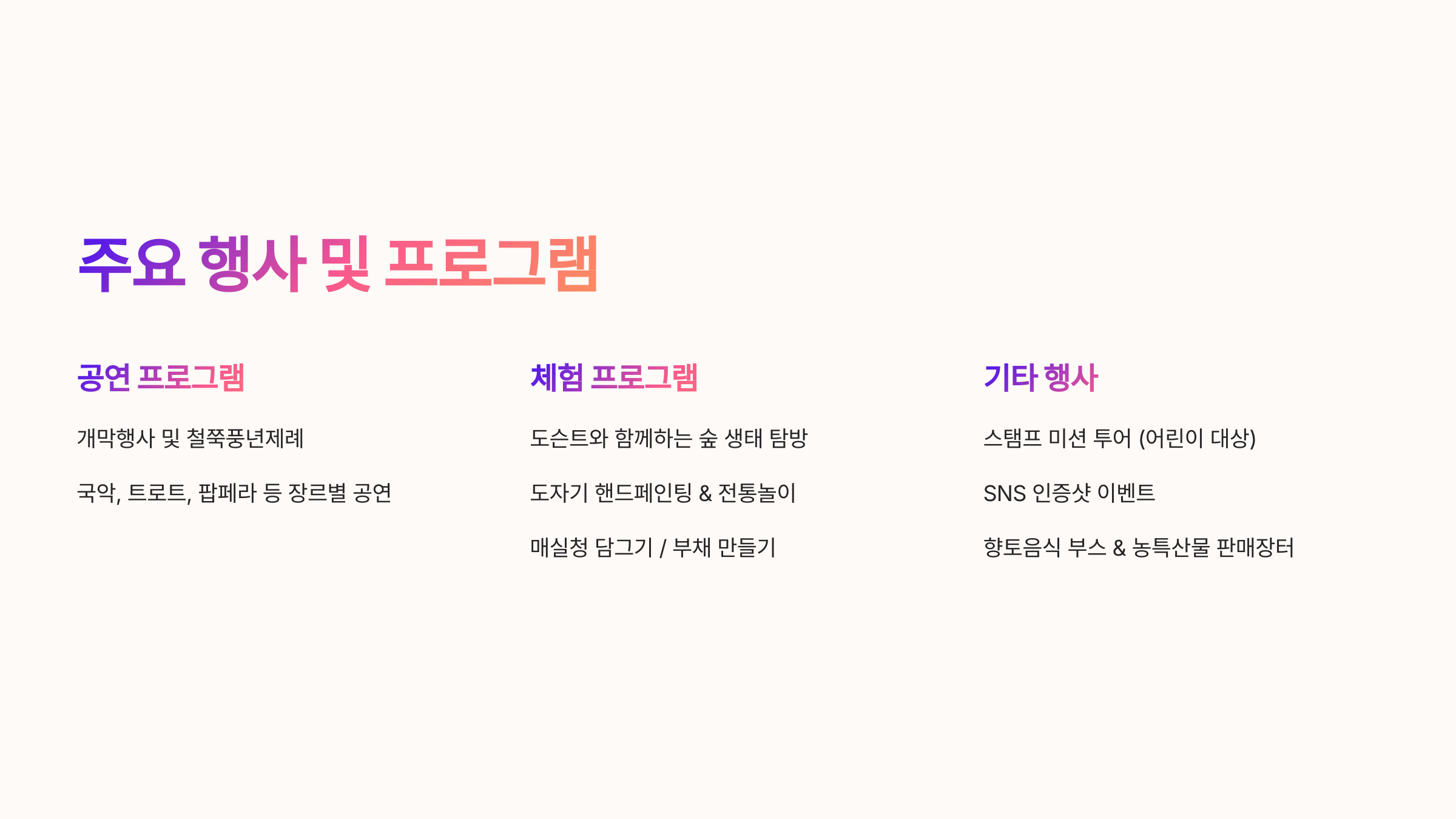 - 체험 부스: 도자기 페인팅, 매실청 만들기, 숲 해설 탐방, 부채 꾸미기