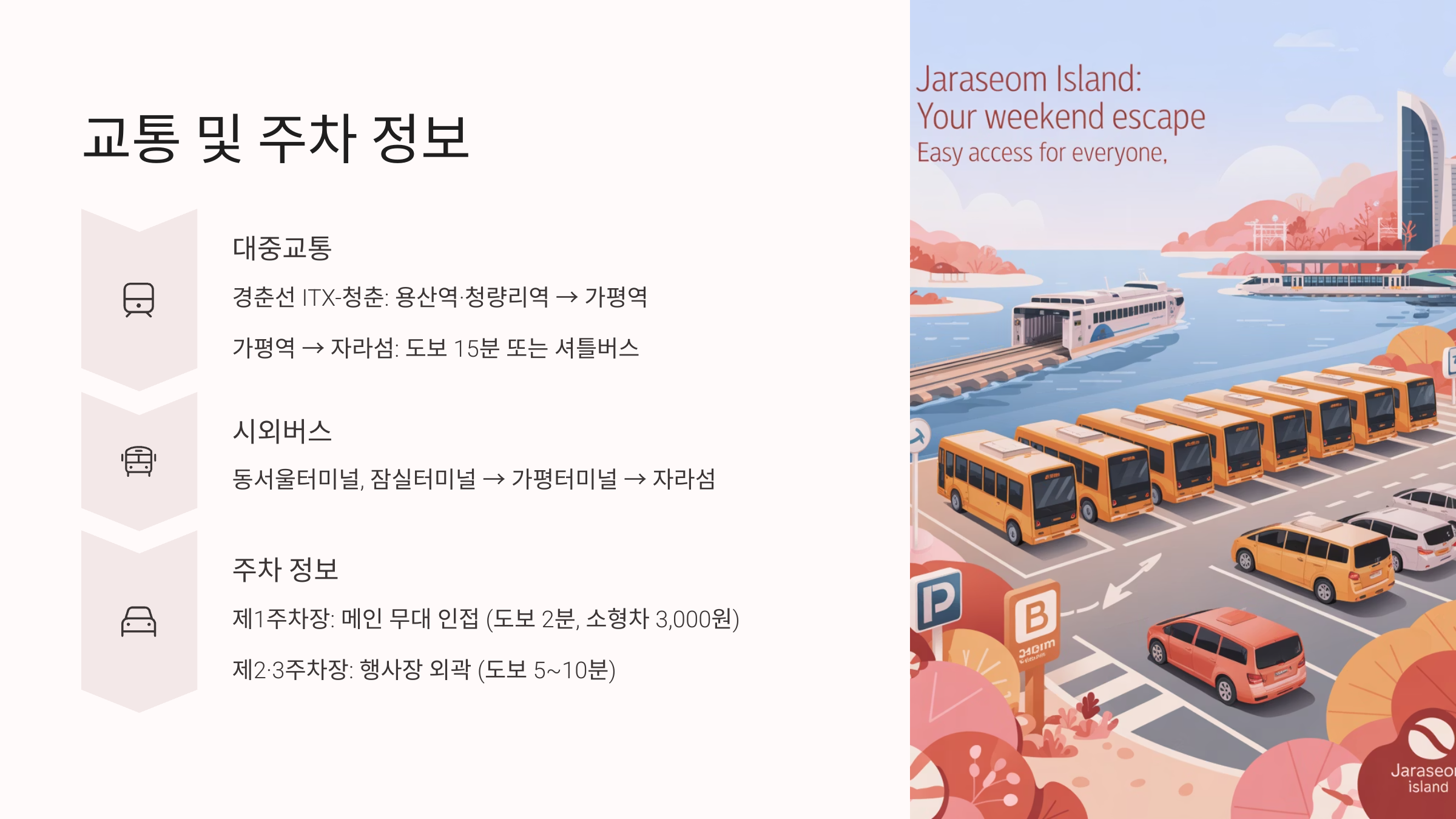 - 가평역 → 자라섬: 도보 15분 또는 셔틀버스 (운행 시 공지 확인)