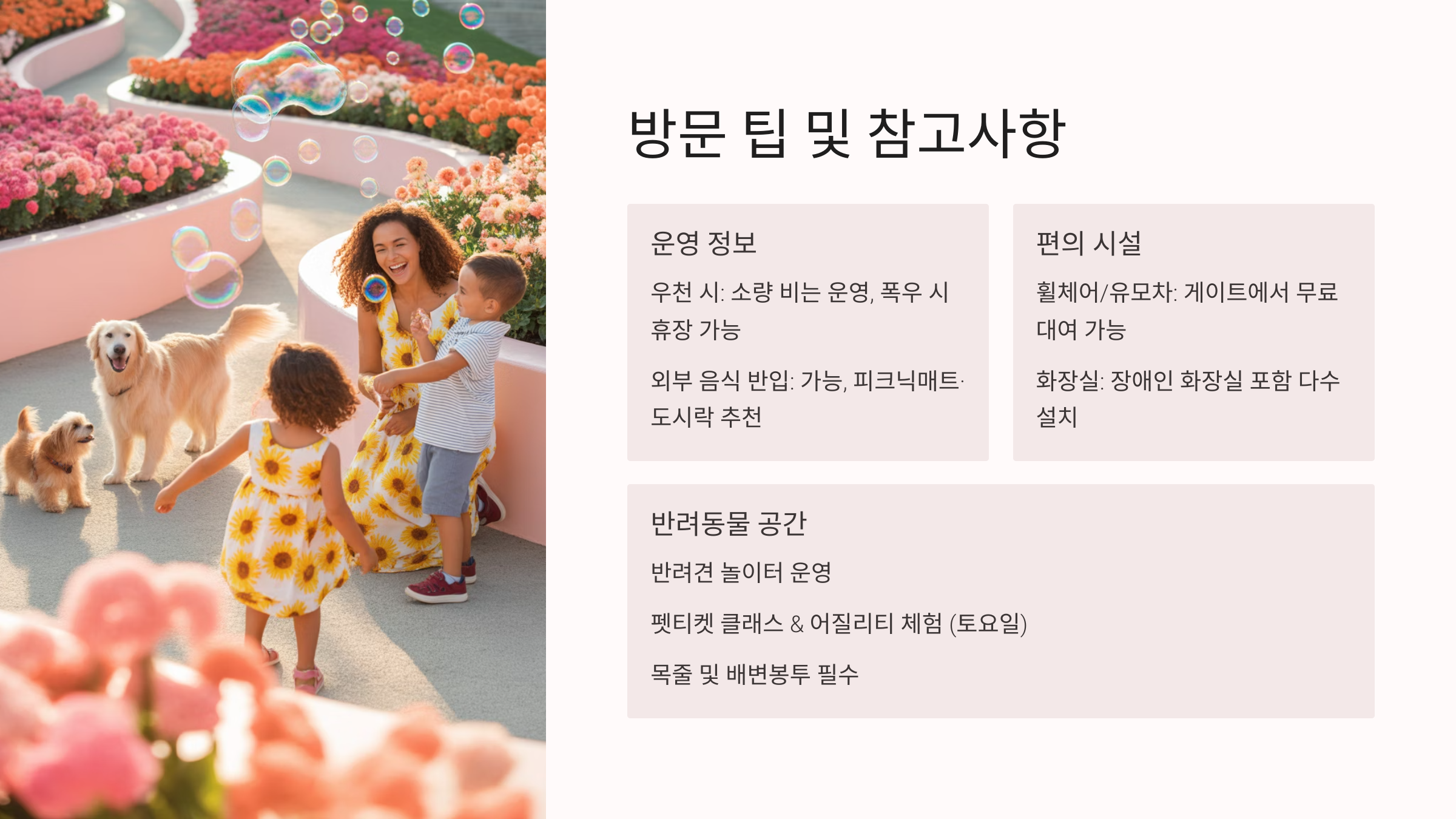 - 우천 시 운영: 소량 비는 운영, 폭우 시 휴장 가능