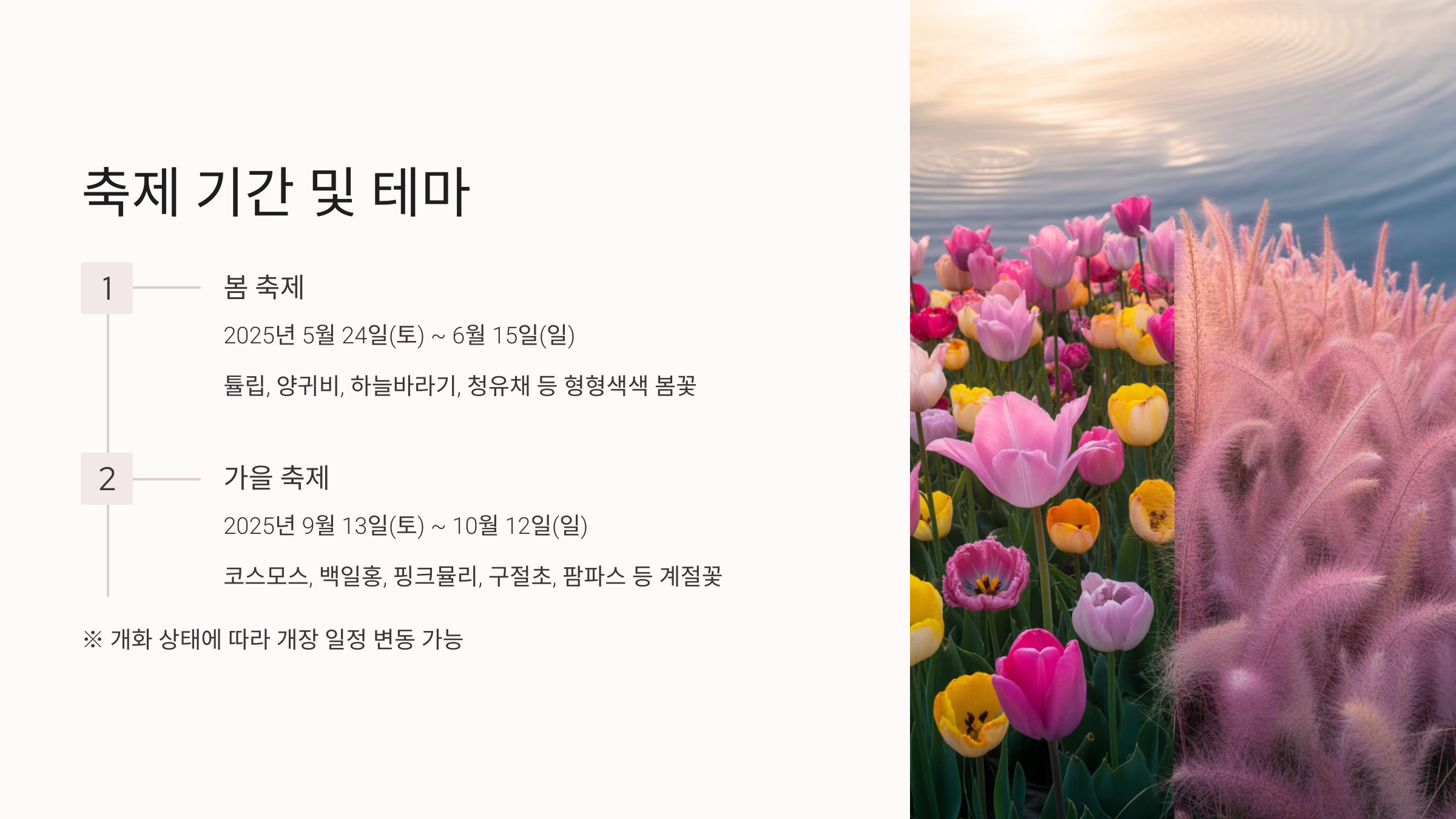 - 가을: 코스모스, 백일홍, 핑크뮬리, 구절초, 팜파스 등 계절꽃 중심