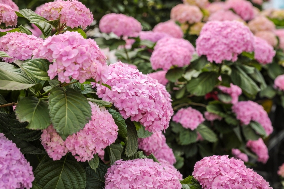- 다양한 품종의 수국이 실외·실내 모두에 풍성하게 조성